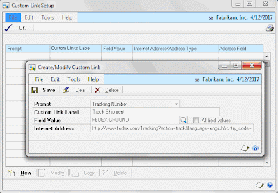 You can access the Custom Link Setup window in the Company section of the Administration page in Dynamics GP 2010 or at Tools>>Setup>>Company>>Custom Link.  Here is a quick example of how you might leverage Custom Links to streamline your processes in Dynamics GP to drill back directly to shipment tracking information from Sales User-Defined Field Entry: