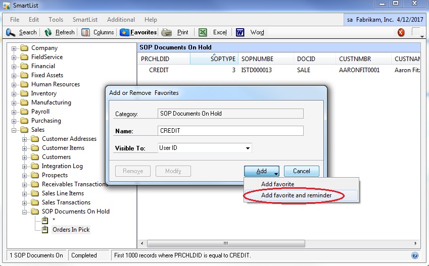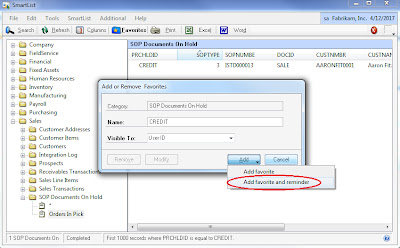 Now, instead of stopping the user in their tracks to make this decision on the fly the Credit Manager can manage this Process Hold separate from the Order Entry Process.  To do this, we used SmartList Builder to build a SmartList that displayed SOP Documents On Hold.  Then, we added a Favorite with a Reminder to the SmartList to show only SOP Documents with the "CREDIT" Process Hold applied.