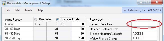 First, we removed the "Exceed Credit Limit" password from Receivables Management Setup: