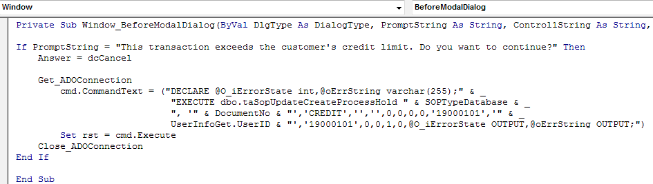 The code calls the taSopUpdateCreateProcessHold eConnect stored procedure and adds the "CREDIT" Process Hold to the Document when the credit limit prompt appears and closes the dialog box by answering Continue to the prompt automatically.